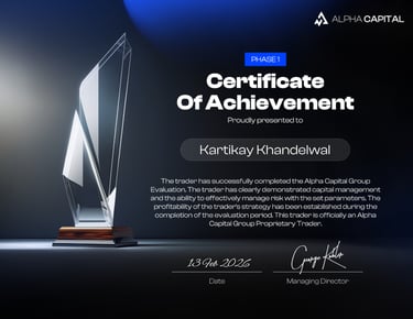 Today marks a deeply emotional milestone in my trading journey. I have successfully completed Phase 1 of the Alpha Capital Evaluation, proving not just profitability, but discipline, patience, and risk management under pressure. This achievement represents countless hours of chart study, emotional control, and staying committed even when the markets tested my belief. Every loss taught resilience. Every win demanded humility. And through it all, I stayed consistent with my system. This certificate is more than recognition — it is proof that persistence, discipline, and trust in the process lead to growth. I step forward with gratitude, confidence, and a stronger mindset, ready for the next phase of the journey.